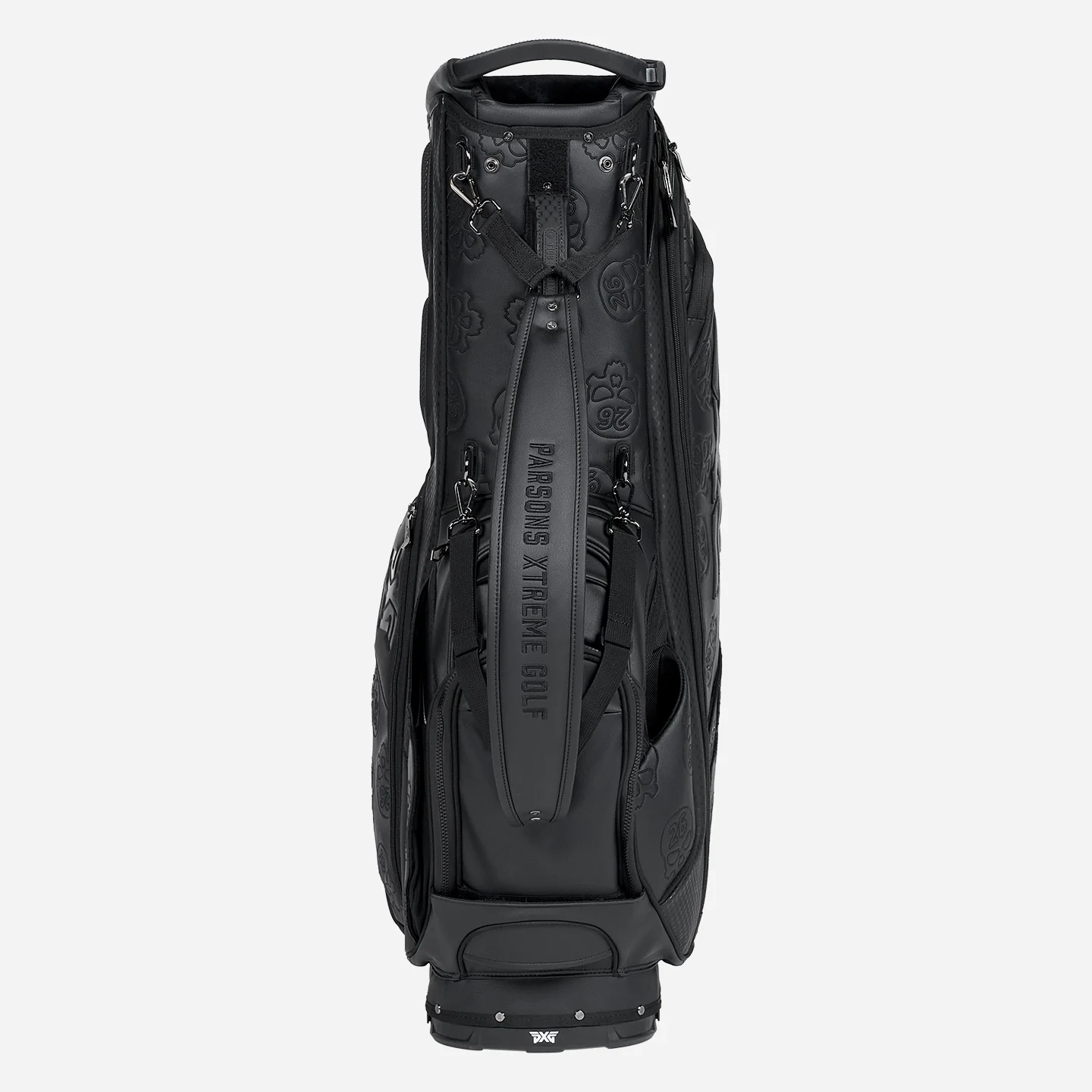 Our Deluxe Hybrid Stand Bag in Darkness Black makes a statement on any golf course. This bag has custom all-over embroidered Darkness Skull insignias along with sophisticated leather logo details. Plus, it has the features of a cart bag with the versatility of a stand bag. A 6-way stop, 14 total pockets, magnetic feet and magnetic putter attachment are just a few of its abundant details. Walk or ride in style with this game-elevating bag.
